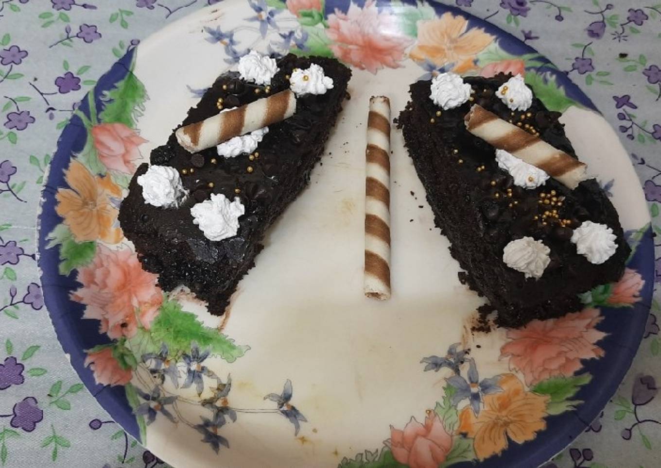 - After that cover the cake and cut into two pieces decorate with chocolate stick and whipped cream now our delicious and tasty chocolate pastry is ready to eat serve it.