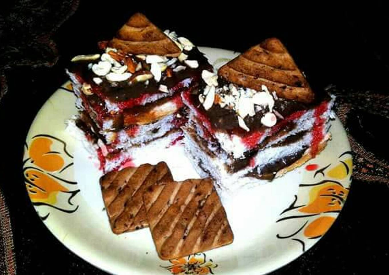 - Spread chocolate on top and garnish with dry fruits and one biscuits