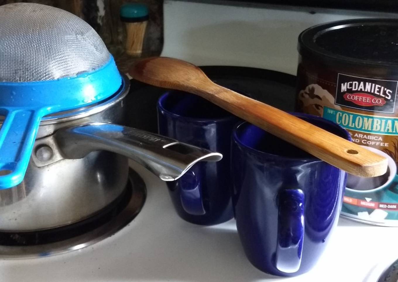 - To serve, pour into cup gently thru tight mesh colander careful not to stir up too many grounds from the bottom of the pan.