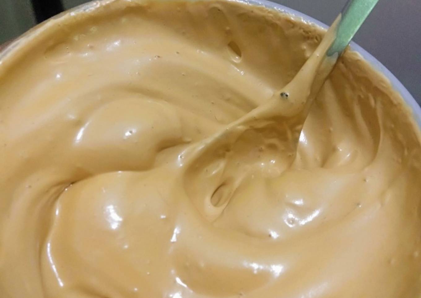 - After a while the mixture will be so thick that it will not drop off the spoon if turned over. I feel it resembles thick coffee butter cream, and oh that smell… so delicious.Do not attempt to lick it off the spoon, that is not very tasty.