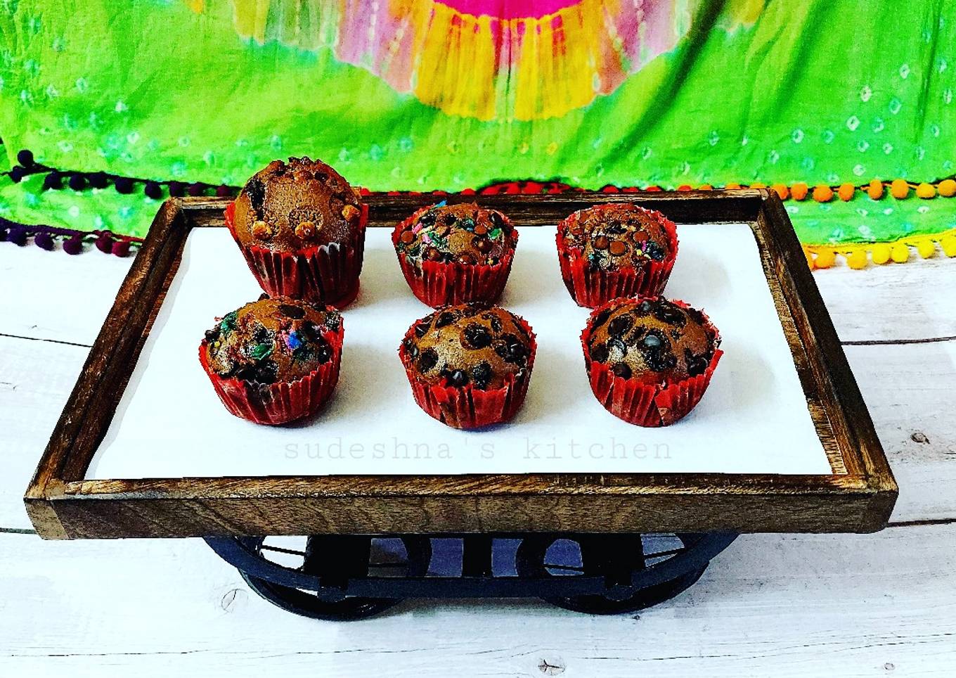 - Sprinkle some choco-chips over it. Then after 7 mins place the muffin moulds over the tray. Cover it immediately and bake it on a low flame for 25 to 30 mins.